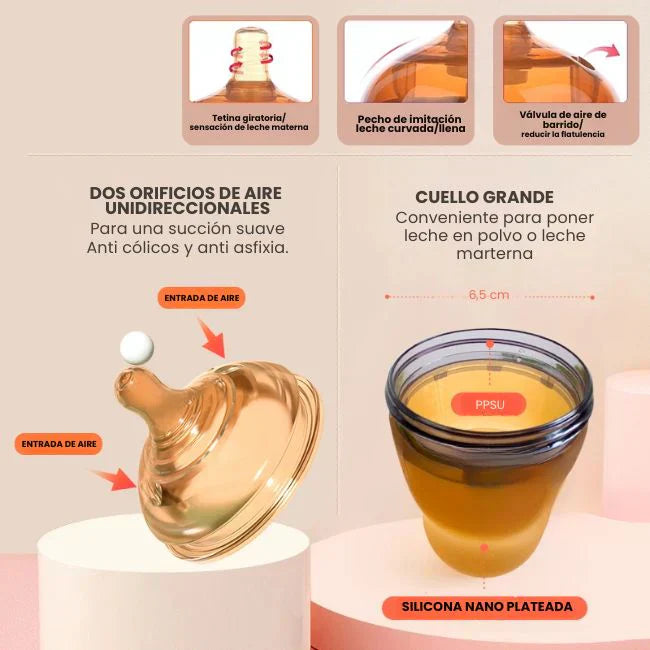 Pezón flexible y doble ventilación previenen cólicos, brindando confort. Su suavidad y diseño similar al pezón materno aseguran una transición sin problemas y la calidez que tu bebé merece. 💖
